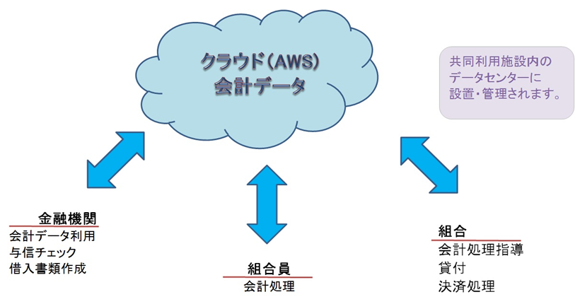 組合の共同利用施設内にサーバーを設置・管理し、組合員の会計・人事・労務・助成金申請・借り入れ等の様々な事務を代行します。